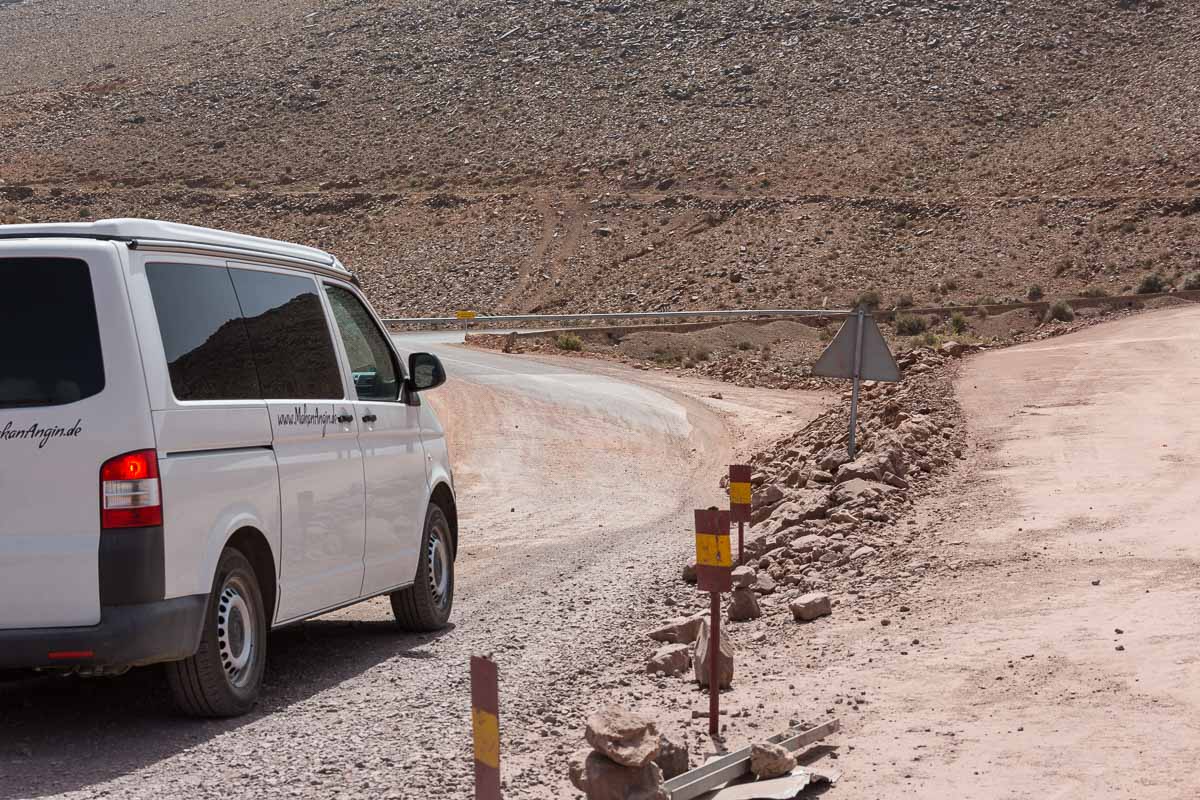 Der Erg Chegaga ist unser nächstes Ziel und wir peilen als Zwischenstation mal Zagora an. Eine Stadt am Fuße des Atlas bevor die Wüste beginnt. In vielen Serpentinen schlängeln wir uns auf 1700 mtr. hinauf. Das Gebirge ist karg und vegetationsarm, aber trotzdem beeindruckend. Der Straßenzustand bietet mal wieder alles – vom Flüsterbelag, über Flickwerk bis hin zur Geröll- oder Sandpiste. Entlang des Valée du Dráa fahren wir gen Südwesten. Ein Abstecher zur einer besonders schönen Kasbah beschert uns eine schöne Festung, aber im Anschluss auch eine vogelwilde Straße – ja, wir hätten umdrehen können – aber es ging ja eine Straße weiter und es kamen uns auch Autos entgegen. Und unser 4motion-drive kommt überall durch – hat der Händler gesagt.